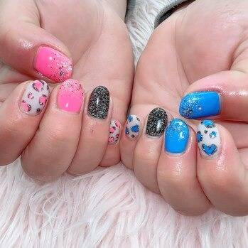 アートし放題 ☆|伏見桃山ネイル こんにちは、ネイル好きの皆さん! 今日は思わず目を引く、華やかで個性的なネイルデザインをご紹介します♪ 今回のデザインは、ピンク×ブルーのポップカラーに、フラッシュ&アニマル柄をミックスした…