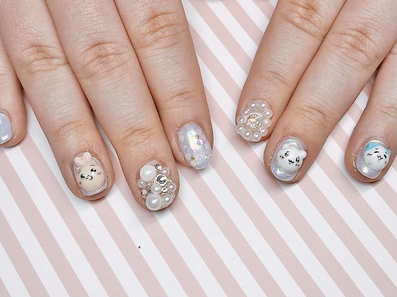 キャラクター以外の爪はオーロラパウダーでパールっぽく。白が基調のシンプルで可愛らしいネイルになりました!