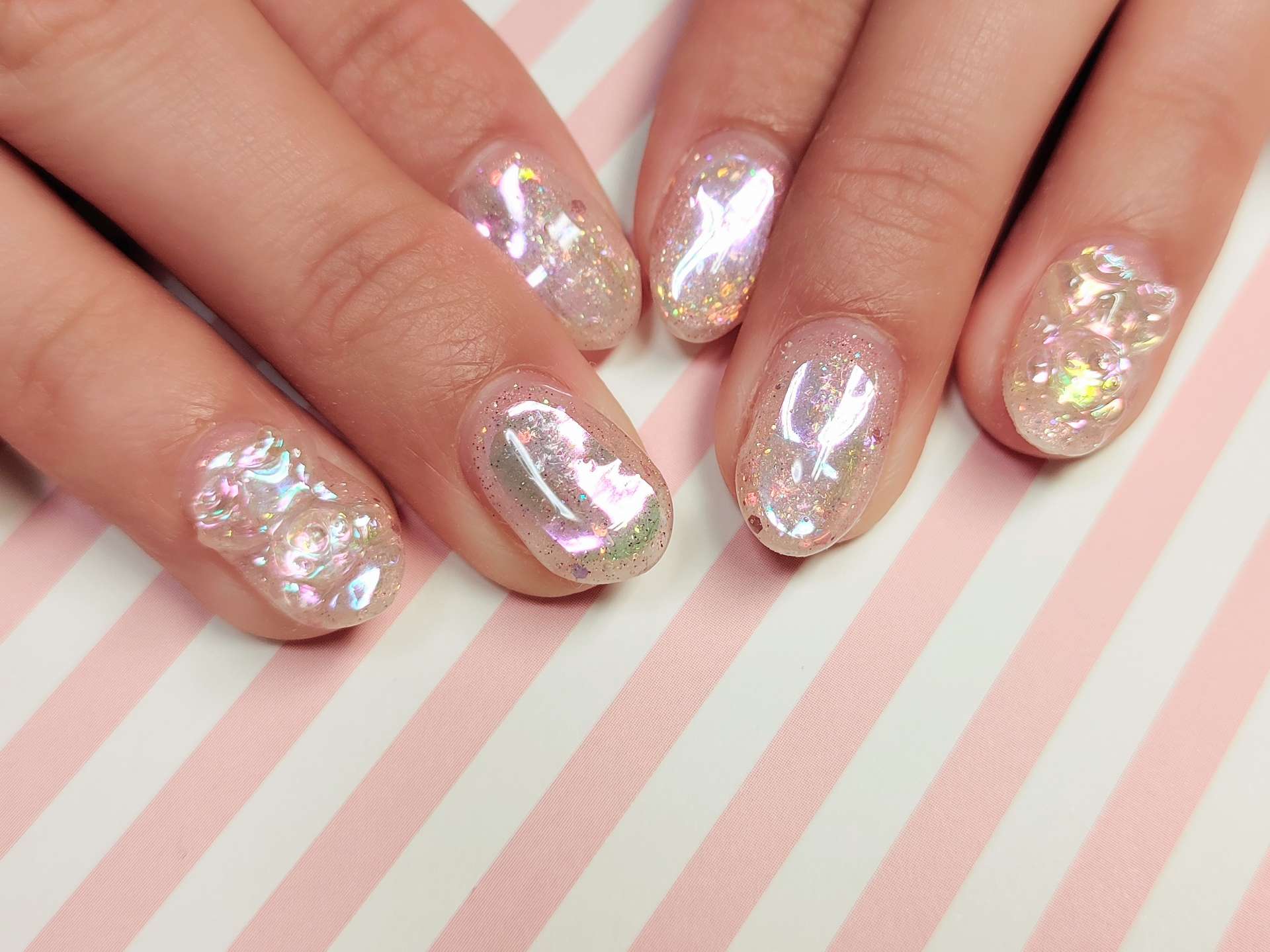 ピンクの氷ネイルはとても可愛い印象に。