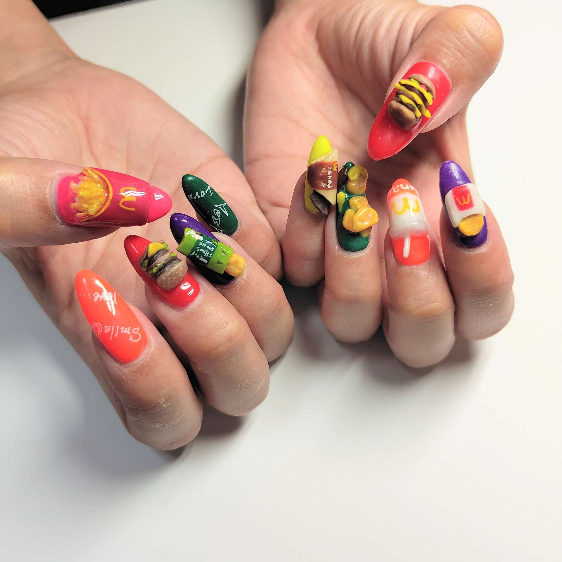 美味しそう🤤 なんだかお腹がすいてくるデザインですね笑 某ハンバーガーチェーン店のポテトが好きすぎて、自分の爪に乗せちゃいました♪♪