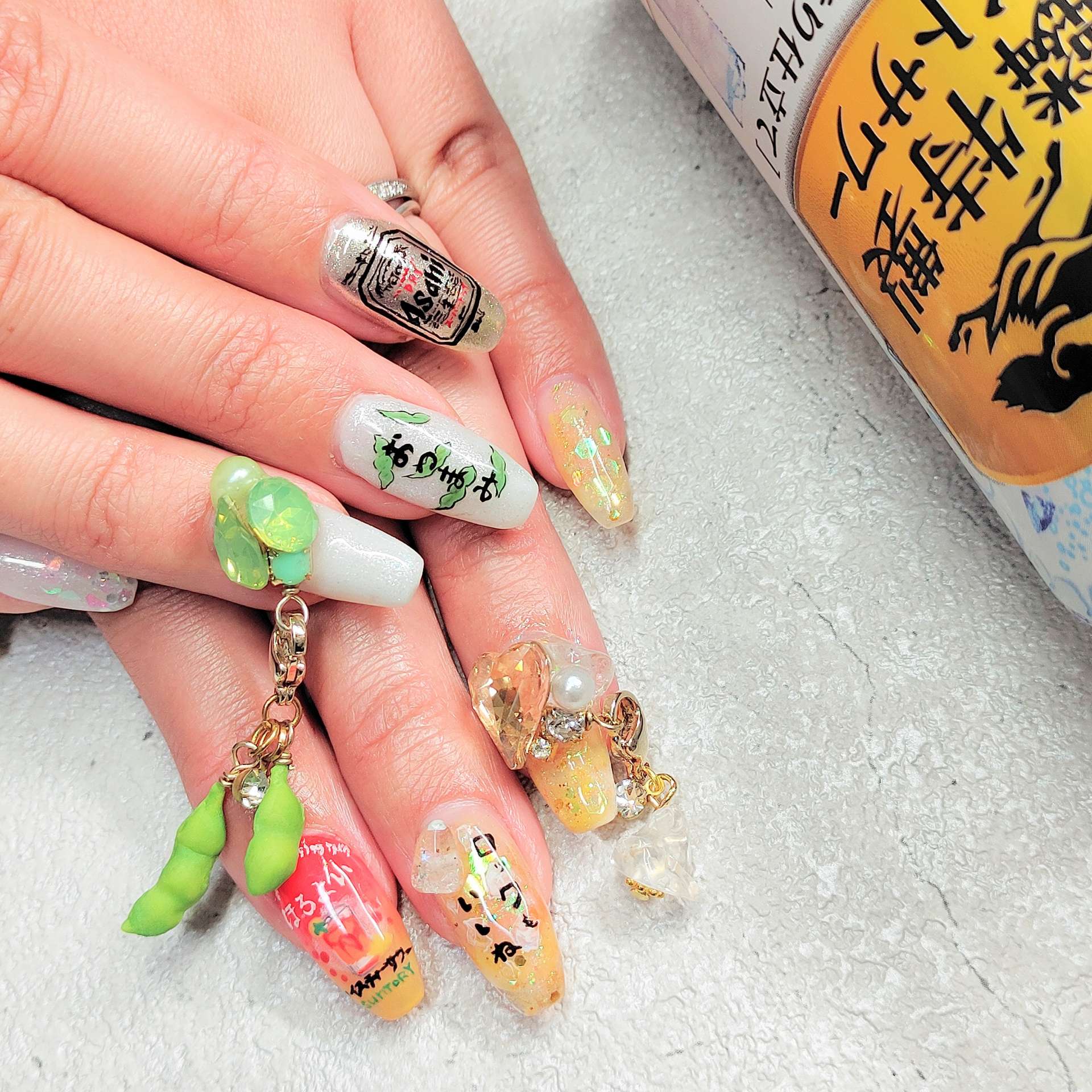 ネイルピアスには枝豆と、ロック(氷)のチャームを作りました✌️ めっちゃ可愛いんですけど、めっちゃ邪魔なのでよく外して作業してるよ。👍